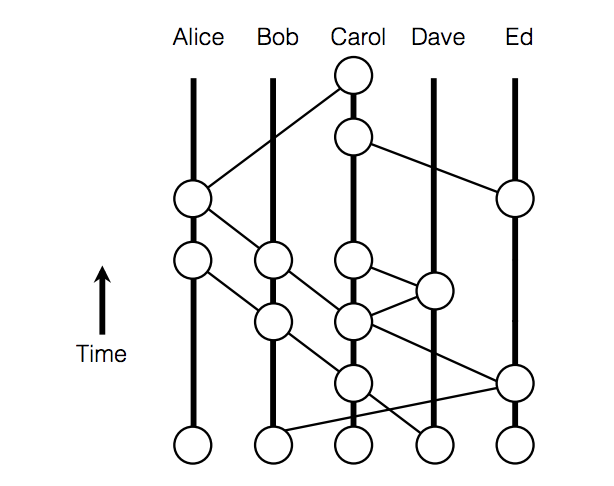 Nodes jointly build a Hashgraph reflecting all of the gossip events. This allows Byzantine agreement to be achieved through virtual voting. Alice does not send Bob a vote over the Internet. Instead, Bob calculates what vote Alice would have sent, based on his knowledge of what Alice knows.
