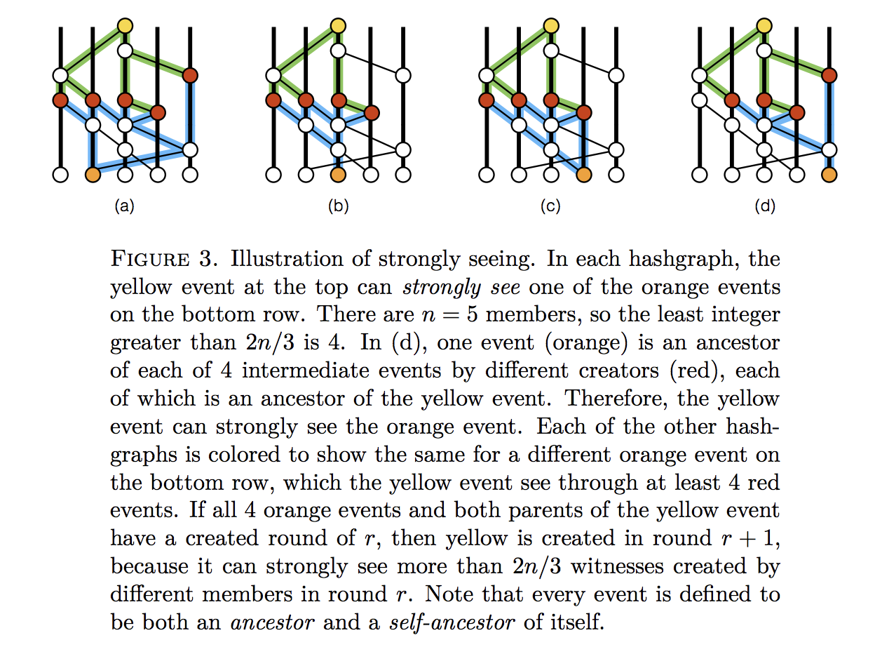 If a node examines its Hashgraph and notices that an event z sees an event x, and not only that, but it can draw an ancestor relationship (usually via multiple routes) through a super-majority of peer nodes, and that a different event from each node also sees x, then it is said that according to this node, z strongly sees x. The example in Figure 2 comes from [12]: