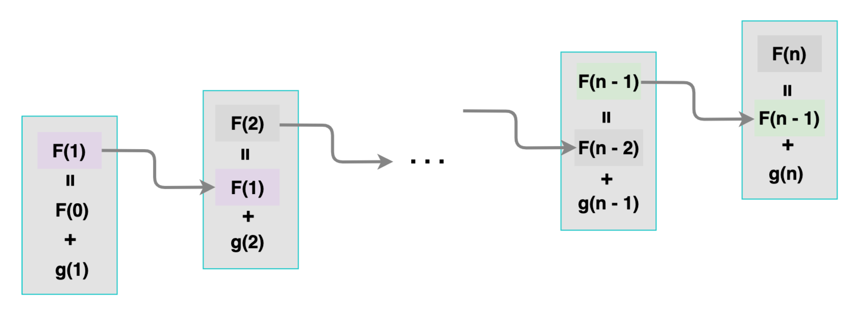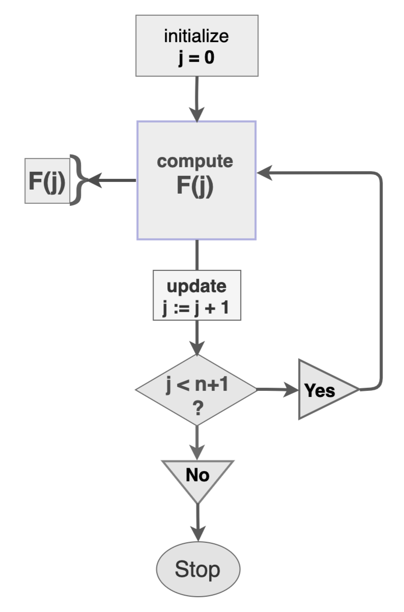 A typical recursive function $F(j)$ for $j \in \{ 0 , 1 , … , n \} $ can be represented in terms of a flow chart, as shown in Figure 1, depicting how values of the sequence $F(0) , F(1), … , F(n)$ are computed.