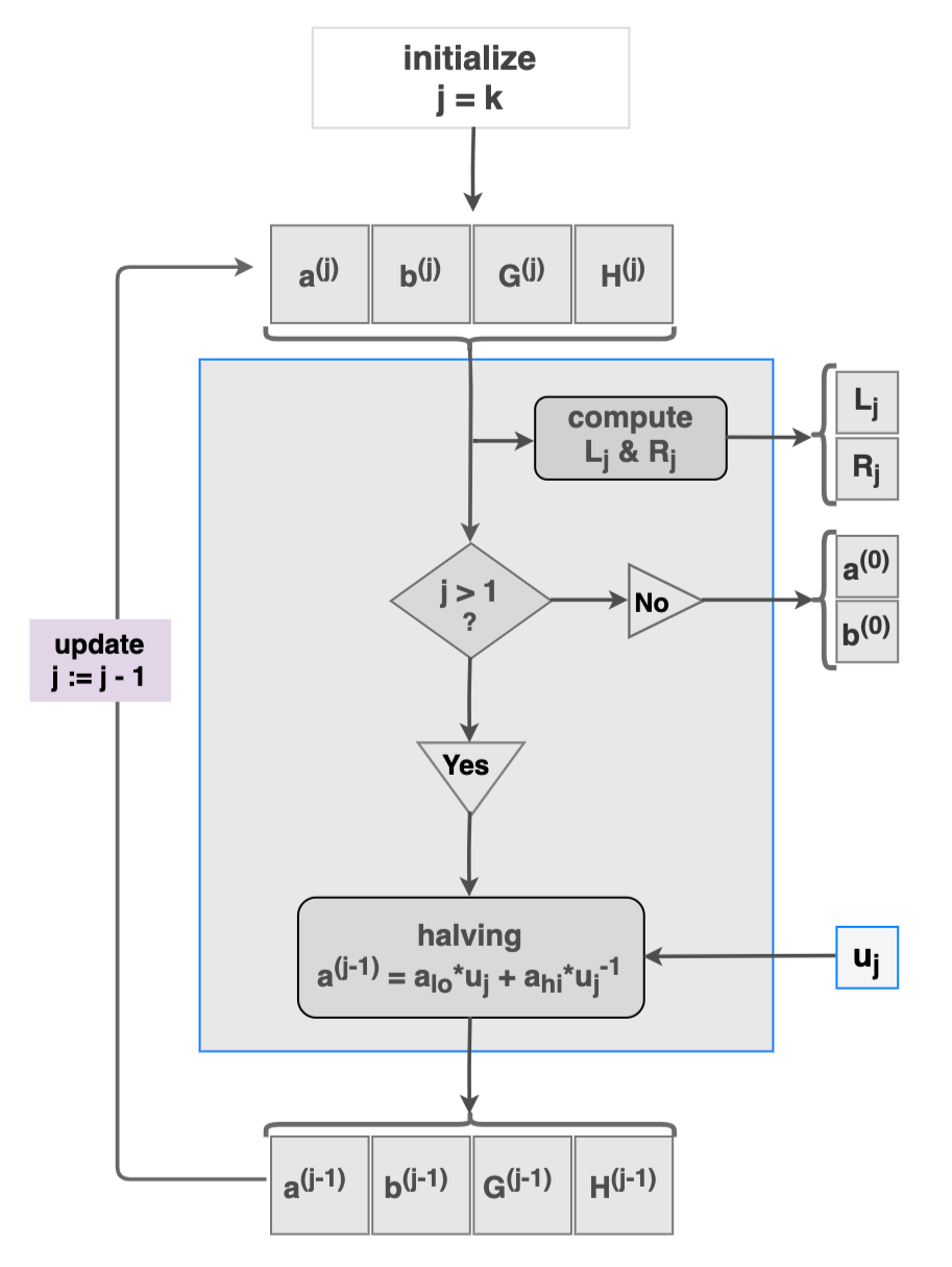 \[\big(\mathbf{a}^{(j-1)}, \mathbf{b}^{(j-1)}, \mathbf{G}^{(j-1)},\mathbf{H}^{(j-1)} \big)\]quadruple vectors each of size $2^{k-1}$, where
