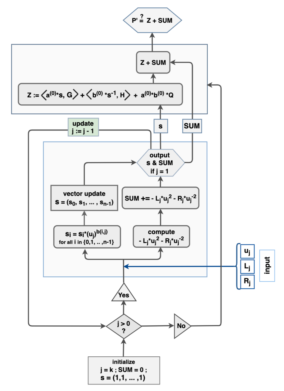 \[P_{k - 1} = P_k + L_k \cdot u_k^{2} + R_k \cdot u_k^{-2}\]where $ L_k $ and $ R_k $ are specifically defined as linear combinations of inner-products of vectors that are half the size of vectors in the $k - 1$ round.