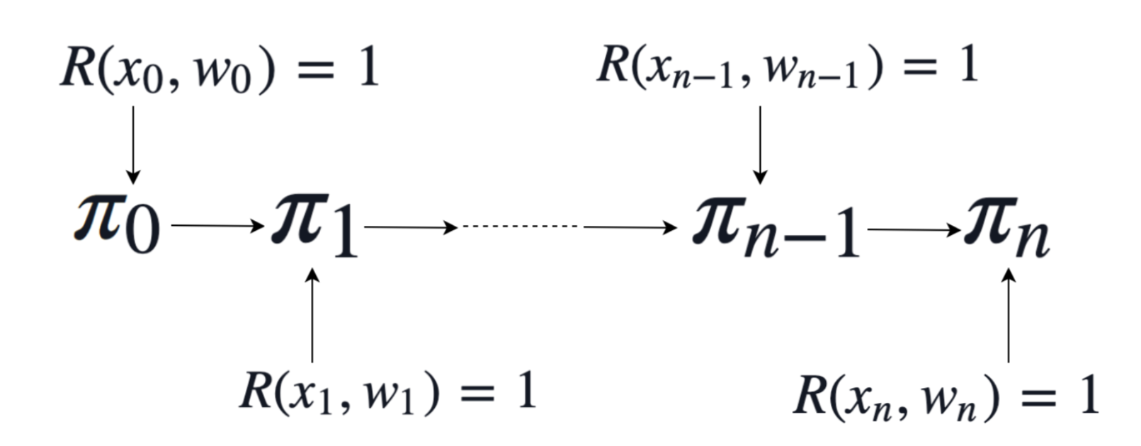 - the proof $\pi_n$ for any $n>0$ will then prove that the prover knows $( x_n , w_n )$, such that $\mathcal{R}(x_n , w_n ) = 1$ and that a proof $\pi_{n-1}$ was produced, attesting to the knowledge of $(x_{n−1} , w_{n−1})$.