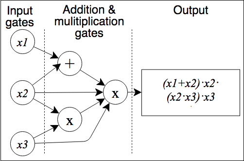 - Arithmetic Circuits: An arithmetic circuit $ C $ over a field $ F $ and variables $ (x_1, …, x_n) $ is a directed acyclic graph whose vertices are called gates. Arithmetic circuits can alternatively be described as a list of addition and multiplication gates with a collection of linear consistency equations relating the inputs and outputs of the gates. The size of an arithmetic circuit is the number of gates in it, with the depth being the length of the longest directed path. Upper bounding the complexity of a polynomial $ f $ is to find any arithmetic circuit that can calculate $ f $, whereas lower bounding is to find the smallest arithmetic circuit that can calculate $ f $. An example of a simple arithmetic circuit with size six and depth two that calculates a polynomial is shown below ([[29]], [47]).