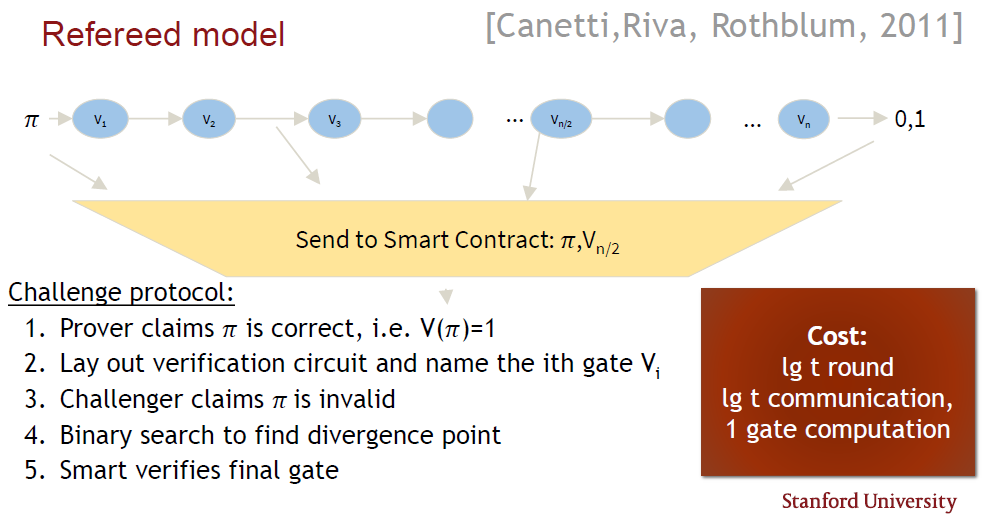 A challenger will input the proof to the verification circuit and get a binary response as to the validity of the proof. The challenger can then complain to the smart contract, claim the proof is invalid and send the proof, together with the output from a chosen gate in the verification circuit, to the smart contract. Interactive binary searches are then used to identify the gate where the proof turns invalid. Hence the smart contract must only check a single gate in the verification procedure to decide whether the challenger or prover was correct. The cost is logarithmic in the number of rounds and amount of communications, with the smart contract only doing one computation. A Bulletproof can be calculated as a short proof for the arbitrary computation in the smart contract, thereby creating privacy-preserving smart contracts (refer to Figure 4).