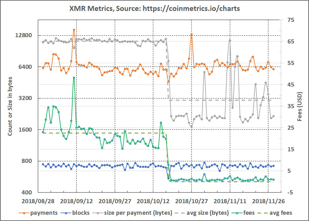 The recent implementation of Bulletproofs in Monero on 18 October 2018 saw the average data size on the blockchain per payment reduce by ~73% and the average USD-based fees reduce by ~94.5% for the period 30 August 2018 to 28 November 2018 (refer to Figure 3).