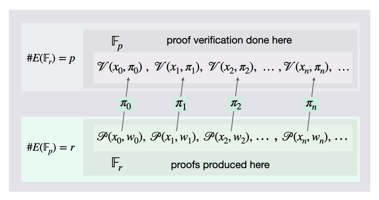 See Figure 3 above for a simplified depiction of a recursive proofs system using an Amicable pair of elliptic curves.