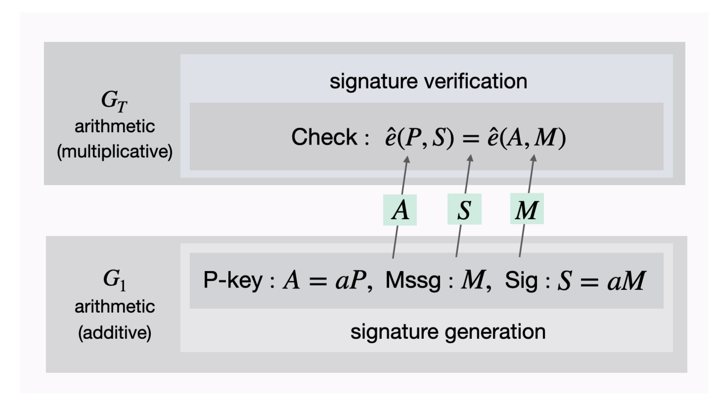 This is why the verification works, \(\hat{e}(P,S) = \hat{e}(P, aM) = \hat{e}(P,M)^a\) \(\hat{e}(A,M) = \hat{e}(aP,M) = \hat{e}(P,M)^a\)
