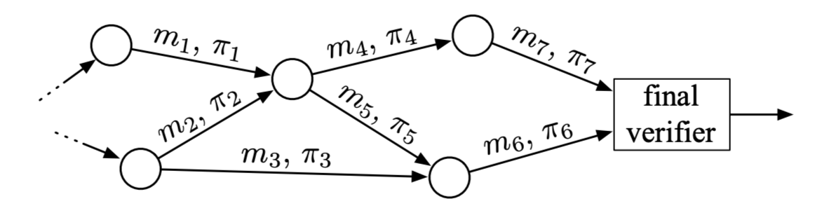 - due to proof strings attached to all previous messages, any node $j$ can verify any intermediate state of the computation and propagate a new message $m_j$ with its proof string $\pi_j$ attached to it.