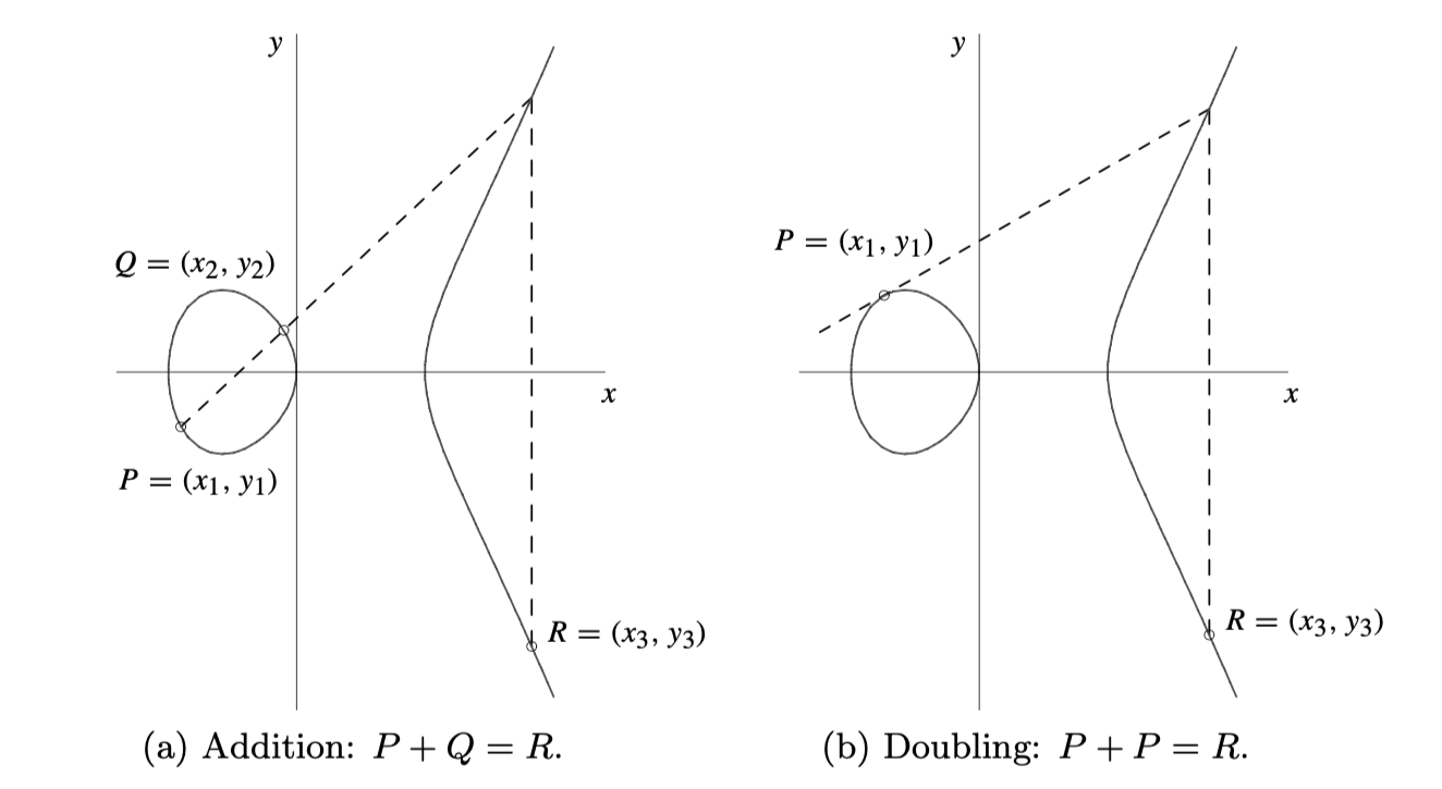An elliptic curve group $E(\mathbb{F})$ is formed by first defining ‘addition’ of elliptic curve points, picking a point $(x,y)$ on the curve $E$ and using it to generate a cyclic group by doubling it, $2 \cdot (x,y)$, and forming all possible scalar multiples $\alpha \cdot (x,y)$. The group ‘addition’ of points and doubling are illustrated in Figure 1 below. All these points generated by $(x,y)$ together with the point at infinity, $ \mathcal{O}$, form an algebraic group under the defined ‘addition’ of points.