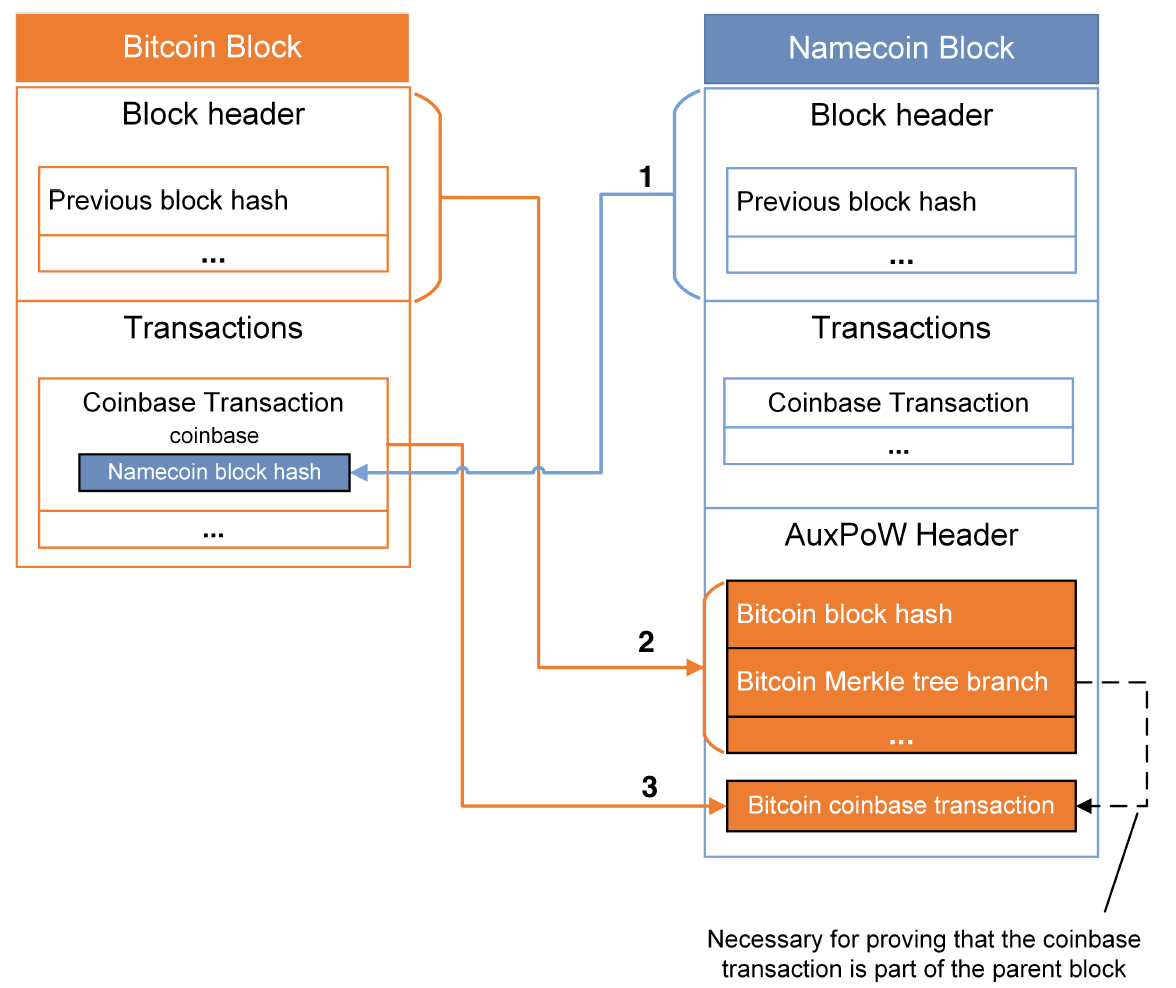 As an example, the structure of merged mined blocks in Namecoin and Bitcoin is shown here [[25]]: