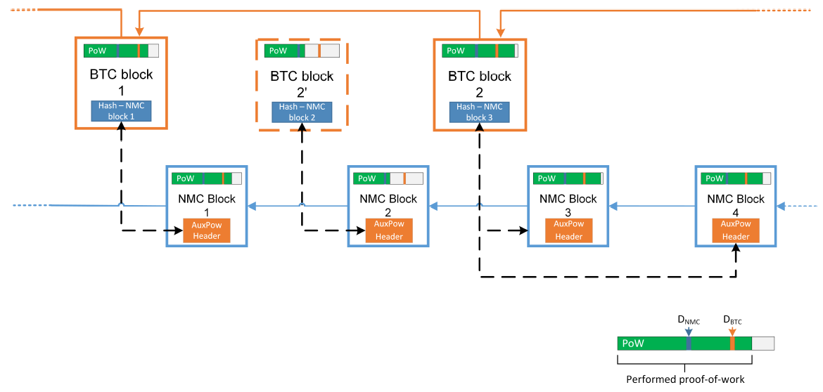 The propagation of Parent and Auxiliary blocks is totally independent and only governed by each chain’s difficulty level. As an example, the following diagram shows how this can play out in practice with Namecoin and Bitcoin when the Parent difficulty (DBTC) is more than the Auxiliary difficulty (DNMC). Note that BTC block 2’ did not become part of the Parent blockchain propagation.