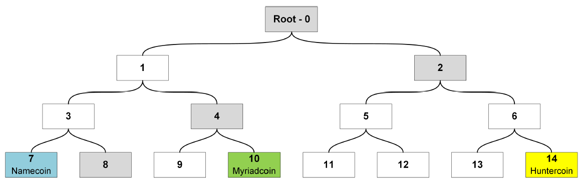 A miner can use a single Parent to perform merged mining on multiple Auxiliary blockchains. The Merkle tree root of a Merkle tree that contains the block hashes of the Auxiliary blocks as leaves must then be inserted in the Parent’s coinbase field as shown in the following diagram. To prevent double spending attacks, each Auxiliary blockchain must specify a unique ID that can be used to derive the leaf of the Merkle tree where the respective block hash must be located [[25]].