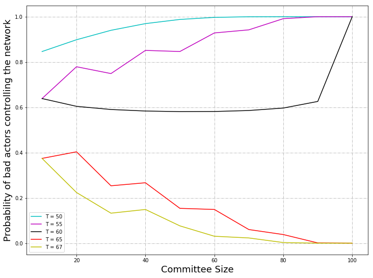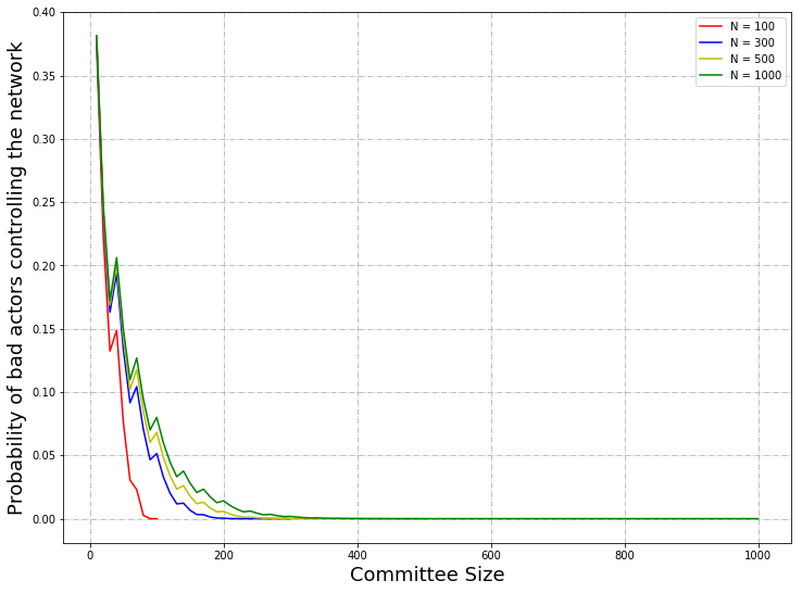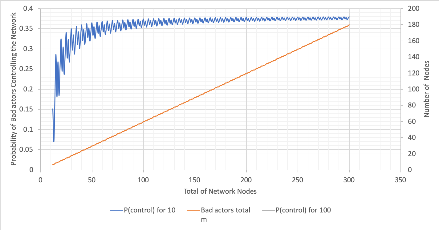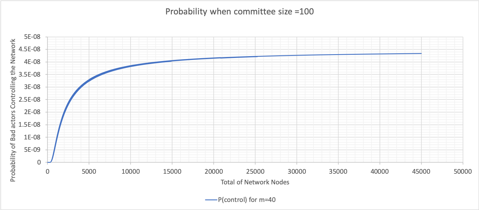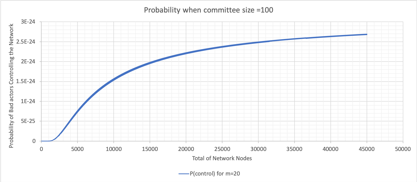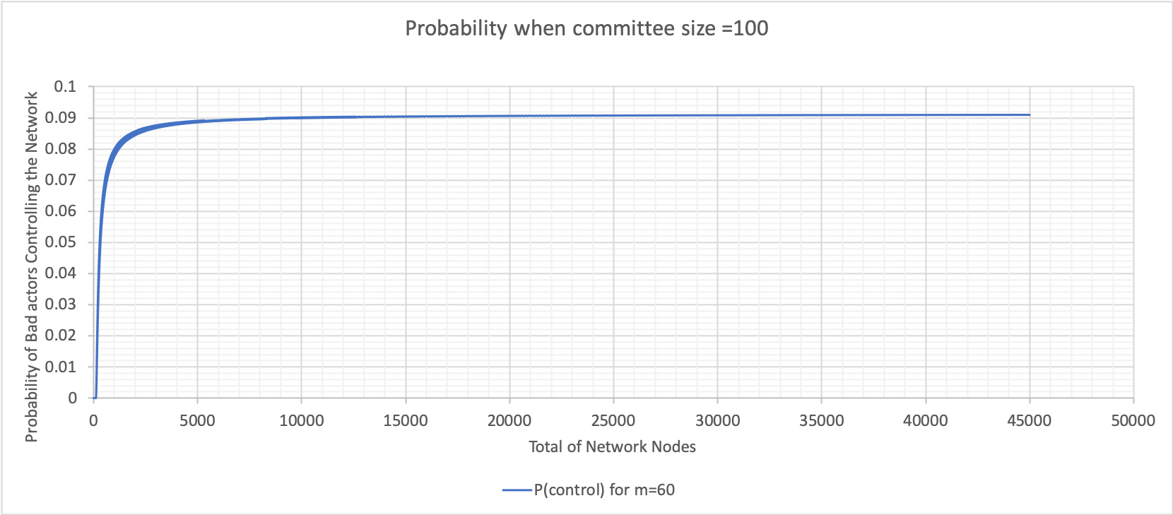 The above graph was calculated using Excel (variations of N with n fixed). For the graph showing varying probabilities with respect to the total number of network nodes, where the committee size is $10$, the probability dramatically increases when the total nodes is $3$ times more than the committee size and onwards. The probability plateaus at $0.35$.