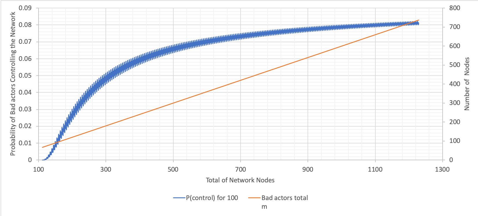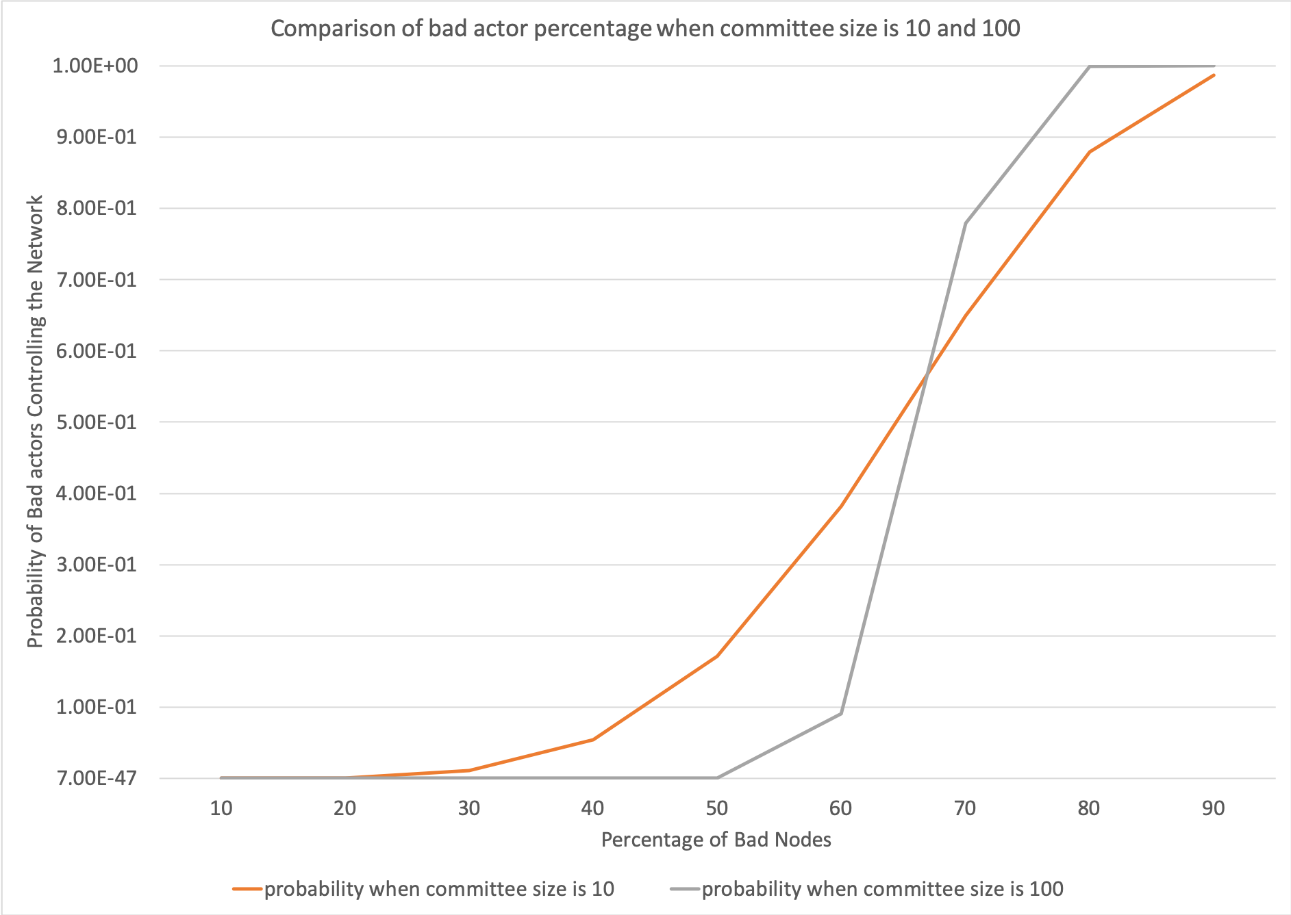 - Committee size: The larger the committee size, the lower the probability of bad actors controlling the network. This can be seen in the graph in Variation of Total Number of Nodes with Committee Size 10 and Variation of Total Number of Nodes with Committee Size 100.