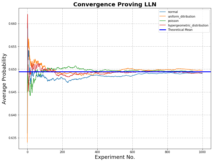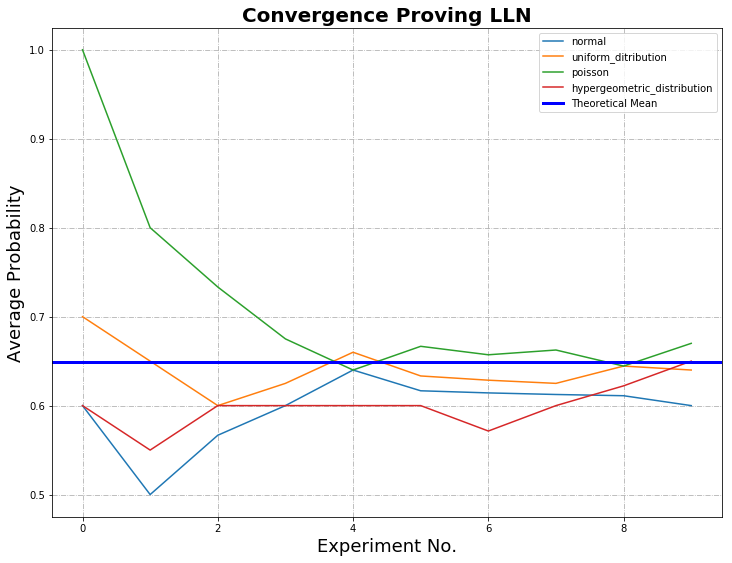 In each graph, the cumulative probabilities calculated for normal, uniform, Poisson and hypergeometric distribution are plotted against the number of experiments. The bold blue line represents the mean calculated from theoretical data.