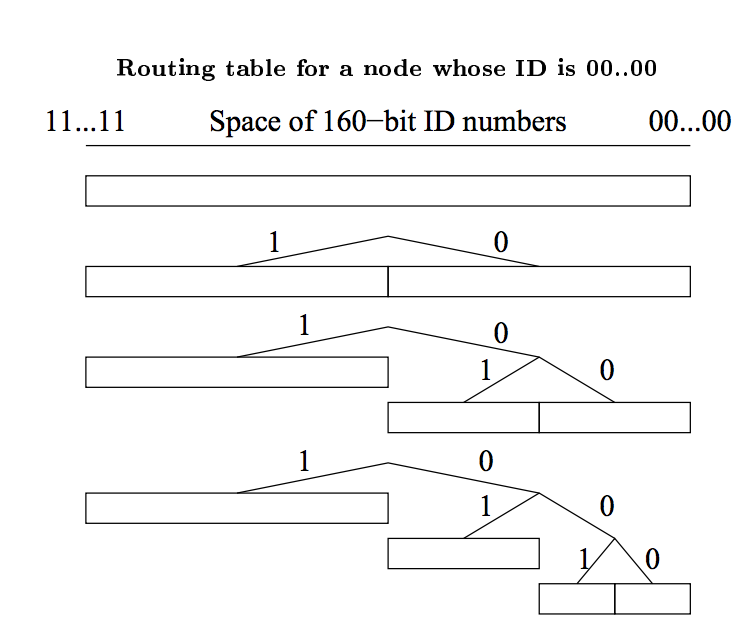 This guarantees that for bucket $j$, where $0 <= j < k$, there is at least one node $N$ in node $A$’s routing table for which \(2^j <= distance(A, N) < 2^{(j+1)}\)
