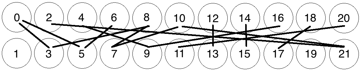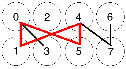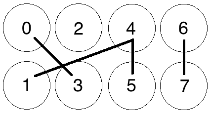 The Cuckoo Cycle algorithm is based on finding cycles of a certain length of edges in a bipartite graph of N nodes and M edges. The graph is bipartite because it consists of two separate groups of nodes with edges that connect nodes from one set to the other. As an example, let’s consider nodes with even indices to be in one group and nodes with odd indices to be in another group. Figure 2 shows eight nodes with four randomly placed edges, N = 8 and M = 4. So if we are looking for cycles of length 4, we can easily confirm that none exist in Figure 2. By adjusting the number of edges present in the graph vs. the number of nodes, we can control the probability that a cycle of a certain length exists in the graph. When looking for cycles of length 4, the difficulty, as illustrated in Figure 2, is that a 4/8 (M/N) graph would mean that the four edges would need to be randomly chosen in an exact cycle for one to exist [29].