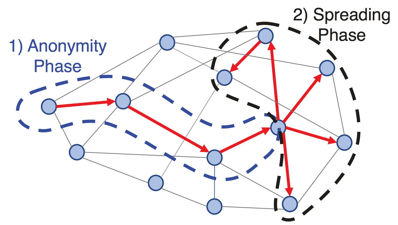 Both Grin and BEAM have incorporated a version of the Dandelion relay protocol, which supports transaction aggregation. One of the major outstanding challenges for privacy that cryptocurrencies face is that it is possible to track transactions as they are added to the mempool and propagate across the network, and to link those transactions to their originating IP addresses. This information can be used to deanonymize users, even on networks with strong transaction privacy. The Dandelion network propagation scheme was proposed to improve privacy during the propagation of transactions to the network [[9]]. In this scheme, transactions are propagated in two phases: the Anonymity (or “stem”) phase and the Spreading (or “fluff”) phase, as illustrated in Figure 1.
